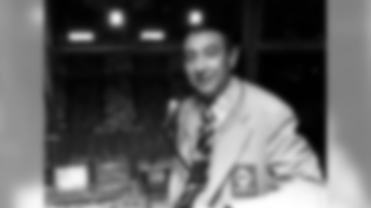 Allie Sherman, left, coach of the New York Giants, quarterback Fran Tarkenton, center, and flankerback Homer Jones, beam at an autographed pigskin at Yankee Stadium in New York, Nov. 12, 1968. The trio were still jubilant over the Giants' victory over the Dallas Cowboys on Nov. 10. (AP Photo/Harry Harris)