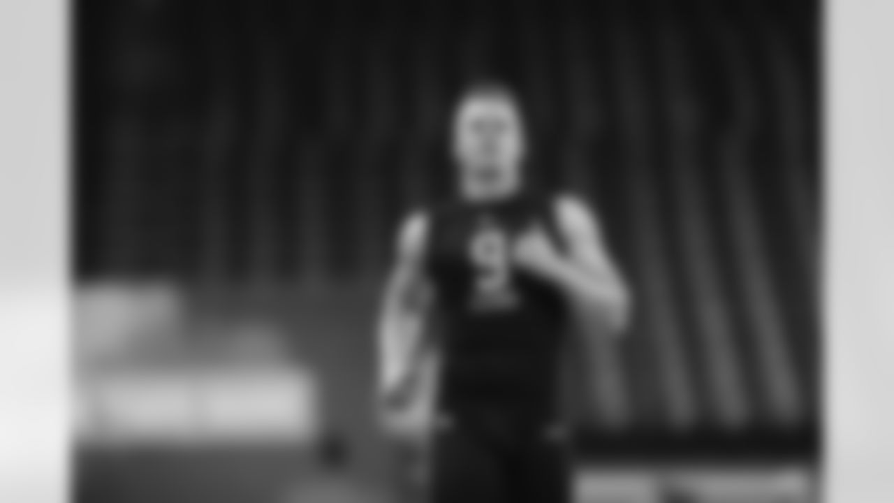 Michigan St. quarterback Brian Lewerke runs the 40-yard dash during the 2020 NFL Scouting Combine, Thursday, Feb. 27, 2020 in Indianapolis. (Ben Liebenberg via AP)